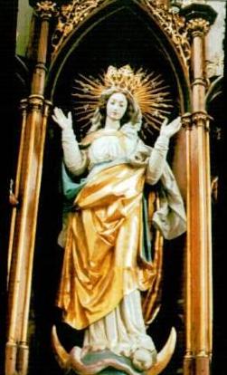 Die Madonna steht auf der Erdkugel, in blauer Farbe dargestellt,