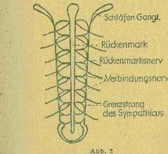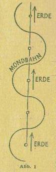 Sonne, wodurch die Mondbahn zu einer Schlangenwindung wird (Abb. 1) Um die Erde bewegt sich der Mond zwar in Kreisform, aber dass die Erde zugleich selbst weiterrückt so ist die eigentliche Mondbahn eine in die Länge gestreckte Kurve, gegen die die Bahn der Erde wie eine Achse erscheint. Die Erde ist im Menschen vertreten durch die Wirbelsäule mit dem Rückenmark. In ihr liegt der Tierkreis (in gewissen Teilpunkten) den ja die Erde durchläuft. Die Mondbewegung zeigt sich in dem paarig angelegten, sich nach oben windenden Grenzstrang des sympathischen Nervensystems. Seine beiden Stränge haben Kreuzungspunkte im Rückenmark, wodurch sie in ihrem rechts- und linksseitigen Austausch zu einer doppelten Schlangenwindung werden. Die paarige Anordnung hängt damit zusammen, dass jeder Mensch in der Anlage zweigeschlechtlich ist; man kann die linke Seite die männliche, die rechte die weibliche nennen. Nun bewegt sich die Erde mit ihrem Mond um |