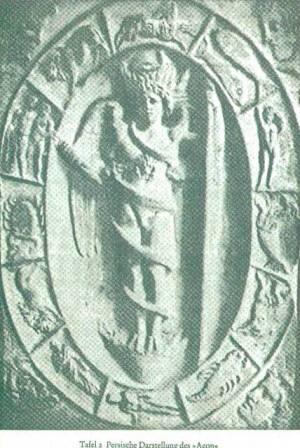 | Aus Karel Weinfurter's "Mystischer Fibel" (Tafel 2 / Persische Darstellung des "Aeon") "Auf dem nebenstehenden Bild sehen wir einen Menschen, der aus dem Feuer wiedergeboren ist. Seine Füsse sind die eines Geissbocks, was bedeutet, das dies ein irdischer Mensch ist und dass er vor seiner Einweihung ein halbes Tier war - so wie jeder körperliche und äussere Mensch. Aber unter seinen Füssen ist ein Feuer, aus dem er hervorging und wodurch er gereinigt wurde. Es ist das jenes Feuer, das alles verzehrt, nur das "reine Gold" wird von ihm verschont. Das bedeutet, dass nur der Geist übrig bleibt, der eben im Feuer lebendig ist und der mit dem Feuer arbeitet. Natürlich ist das ein anderesFeuer als das irdische. Trotzdem strahlt es Wärme und Licht aus. Die Wärme ist die göttliche Liebe und das Licht die göttliche Weisheit. Von den Füssen der Gestalt bis zum Haupt windet sich eine Schlange. Es ist die göttliche Kundalini, die hochstieg, und der Künstler, der diese Skulptur schuf, bildete sie auf der Oberfläche ab, weil sie sonst nicht bemerkt werden könnte. Der Kopf der Schlange mit dem leuchtenden Auge (Hellsehen) ruht auf dem Scheitel des Adepten, zum Zeichen, dass das ganze "Grosse Werk" vollendet ist, und dass aus dem Menschen ein Engel wurde oder ein Gott, was durch die Flügel angezeigt ist. Diese Flügel versinnbildlichen auch die Beherrschung des Universums und die schnelle Bewegung. Der Adept kann sich zu jedem beliebigen Ort augenblicklich hinbewegen. In der Hand hält der Eingeweihte einen Stab, der eine lange Pilgerfahrt bedeutet, die er vollbrachte, und auch den Führer. In der rechten Hand hält er eine Brennende Fackel, weil er ein Träger des Lichtes für andere ist. In der Mitte der Brust hat er ein Flammenherz. Das ist die geistige Lampe, die er entzündet und die ihn weiter führte. An der Seite hat er ein Schwert, denn wie jeder Meister ist er zugleich auch ein Ritter, ein Kämpfer und Held. Auf dem Haupte trägt er eine Krone, weil er König ist und über dieser ist eine Kugel, welche die Sonne bedeutet, die ihm der führende Stern war. Um die Gestalt herum der Tierkreis mit seinen zwölf Zeichen, was bedeutet, das allein die Schlangenkraft dem Adepten die Kraft gegeben hat, das ganze Weltall zu beherrschen, denn sie ist zugleich die Sonnkenkraft, wie ich dies schon früher erklärte." |