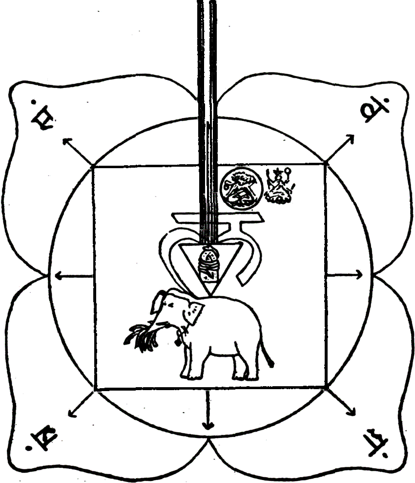Im Quadrat sehen wir einen weißen Elefanten mit sieben Rüsseln. In jedem Lotus befindet sich das Symbol eines Tieres, das in jedem Lotus die Eigenschaften des herrschenden Tattva repräsentiert. So ist der Elefant hier symbolisch dargestellt, ein Zeichen für die Stärke, Festigkeit und Unbeweglichkeit des irdischen Tattva.